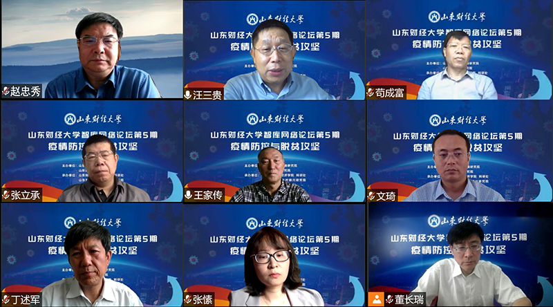 论坛上,中国人民大学中国扶贫研究院院长汪三贵教授分析了疫情对贫困人口家庭收入和脱贫攻坚项目建设的影响,强调要进一步贯彻“精准”理念,根据疫情影响的实际情况因地因户因人施策。山东省人民政府研究室苟成富副主任分析了当下中央和我省疫情防控与脱贫攻坚的政策背景,并总结了山东脱贫攻坚的六大典型做法。中国财政科学研究院金融研究中心副主任张立承研究员以疫情对产业和就业的长短期影响为切入点分析了疫情对脱贫攻坚带来的挑战,并提出财政应对措施。宁夏大学资源环境学院副院长文琦教授认为农村的人力、财力“流入”城市是一种常态,要从主体、产业、环境、治理等方面坚持城乡融合发展。山东财经大学王家传教授阐述了防控常态化下金融扶贫面临的新挑战、新机遇,建议充分运用政策性农业信贷担保机制,创新金融扶贫新模式。山东省鄄城县副县长、山东财经大学丁述军教授从疫情的影响和应对、解决相对贫困长效机制及与乡村振兴战略的衔接等角度报告了鄄城县脱贫攻坚的实践和经验。济南市锦绣川办事处北峪村第一书记张愫同志结合自身挂职工作经历,分析了脱贫攻坚工作遇到的新情况、新问题,主张第一书记要在解决上下脱节、打通政策最后一公里中发挥积极作用。山东财经大学经济学院、乡村振兴研究院院长董长瑞教授坚信在以习近平总书记为核心的党中央领导下,经过全国人民的不懈努力,中华民族定会夺取疫情防控和脱贫攻坚的全面胜利。